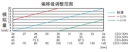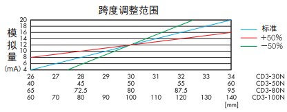 激光位移傳感器CD3系列產品特點: ● 采用高精度CMOS感光元器件。 ● 模擬量輸出設有跨度(SPAN)和歸零設定功能,以滿足各種 應用的需求。 ● 可預設模擬量的上下限值作為報警輸出。 ● 內置數字顯示器。 ● 按鍵示教,數顯面板,操作簡便。簡易的示教按鍵,便于監視的數字顯示器。 ● 無論是反射率高的光澤面,還是如黑色橡膠等低反射率的物體,CD3系列均能穩定測量。 ● 電壓輸出轉換器CV-15 若需要將4-20mA模擬電流輸出轉換成1-5V模擬電壓輸出,則可連接電阻CV-15 。 ● 偏移值 設定偏移值是一個補償功能,可對正負極模擬輸出值進行反轉。 設定范圍為傳感器檢測距離的±50% 。 ● 跨度調整 調整跨度值改變測量值(位移量)與距離之間的比例關系。 設定范圍為傳感器檢測距離的±50% 。 ● 超出量程時的模擬量輸出保持功能 當模擬量值超出量程時,有如下兩種保持功能可選: CLP 模式:模擬量值保持輸出24mA ; HOLD 模式:模擬量輸出值為正常測量時的后一個測量值。 激光位移傳感器CD3系列技術參數:
