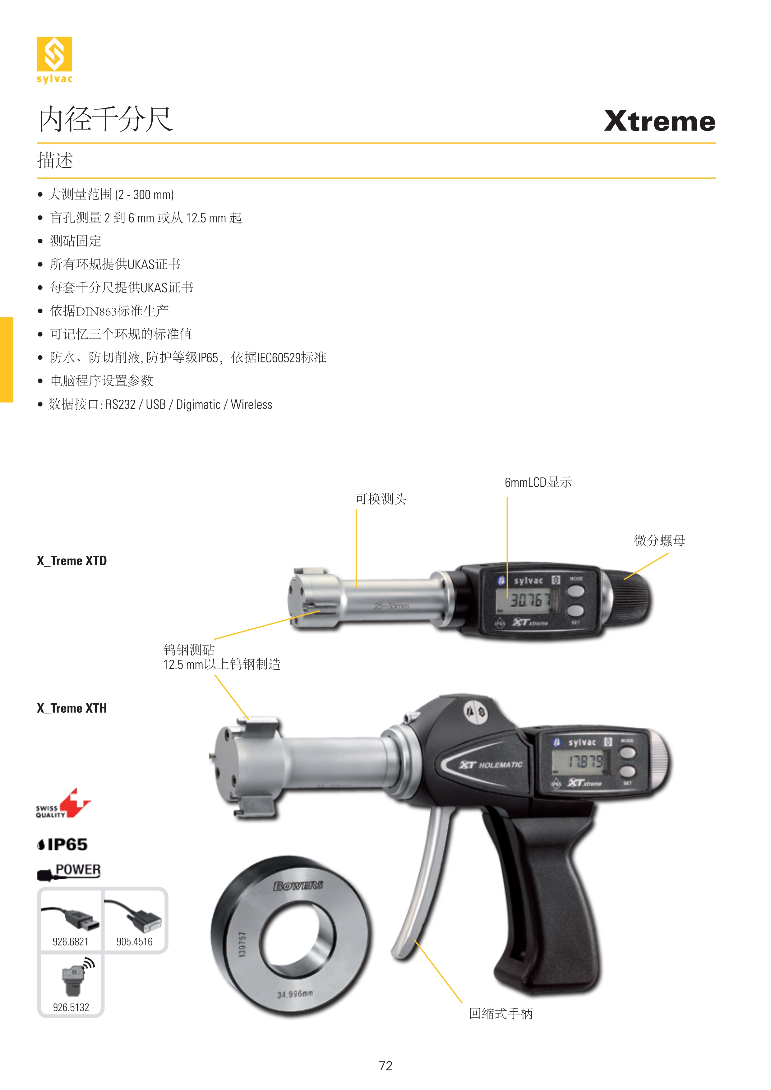 SYLVAC X_Trmem XTH / 槍式三點內徑千分尺.SYLVAC公司的產品范圍極廣,從簡單的機械到高精度的數顯式,可滿足各種內徑測量的要求。操作方式可選擇二點式或三點式,測量速度快、精度高、使用方便,并可選配測頭來測量螺紋花健等特殊工件。 SYLVAC 數顯式內徑千分尺測頭為硬質合金測面,可進行大于12.5mm的盲孔測量,另選特殊測頭可測量環槽、花鍵、螺紋等。