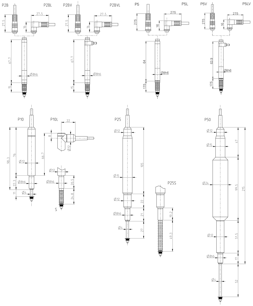 產品介紹筆式傳感器/高精度電感測頭.電子測頭:SYLVAC,P2,P5,P10,P25,P50 高精度電感測頭:SYLVAC,P2,P5,* 圖片為傳感器的應用圖 *B=滾軸軸承;V=真空提升;L=直角型;S=測頭處帶有橡膠保護套。如未特殊注明為摩擦式軸承P10,P25,P50電感測頭,電感傳感器